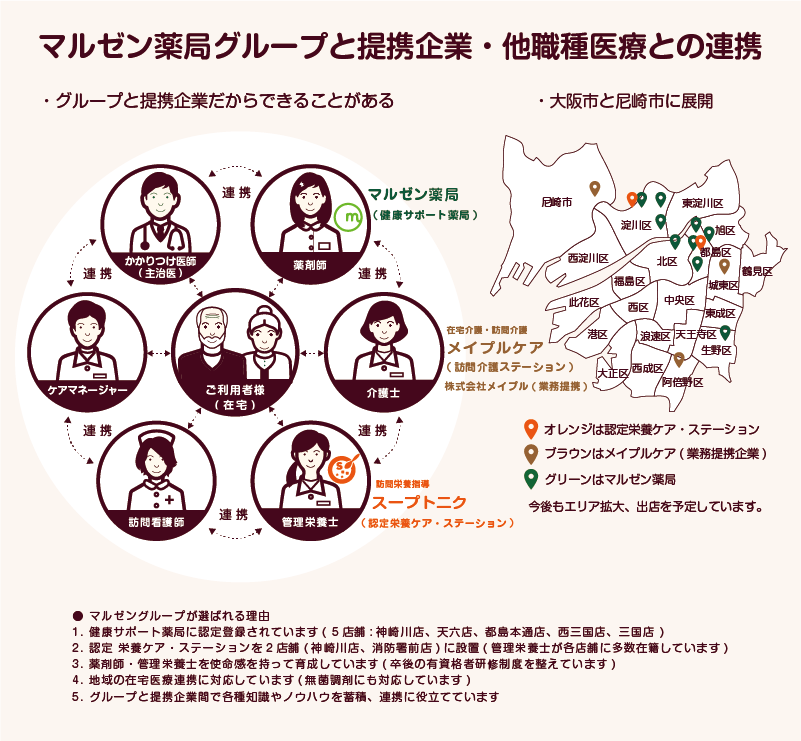 また、訪問介護事業を展開している「株式会社メイプル 」は、マルゼン薬局グループの業務提携企業となります。